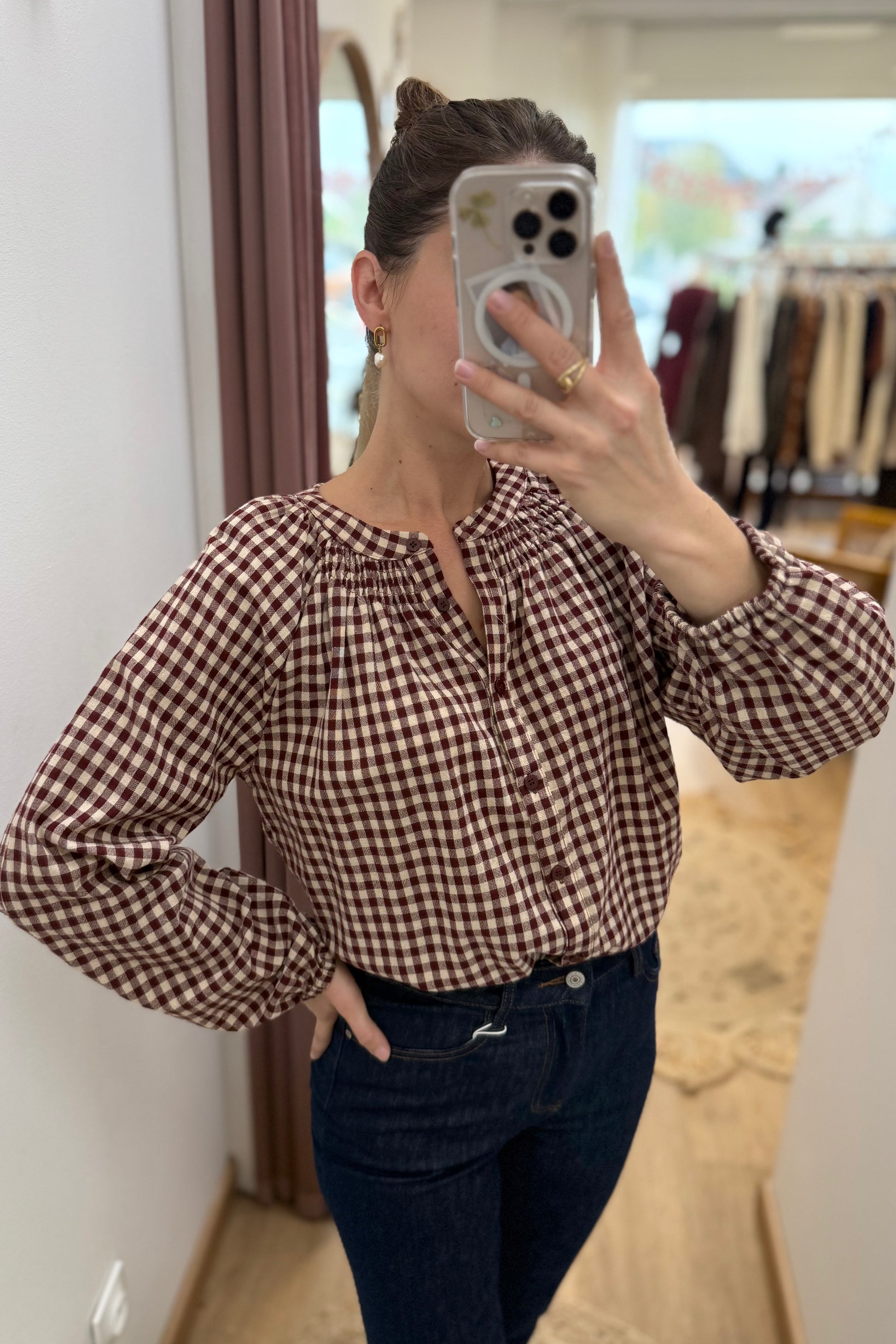 La blouse Gabrielle présente un motif à carreaux bordeaux et camel, un col tunisien et une coupe droite.