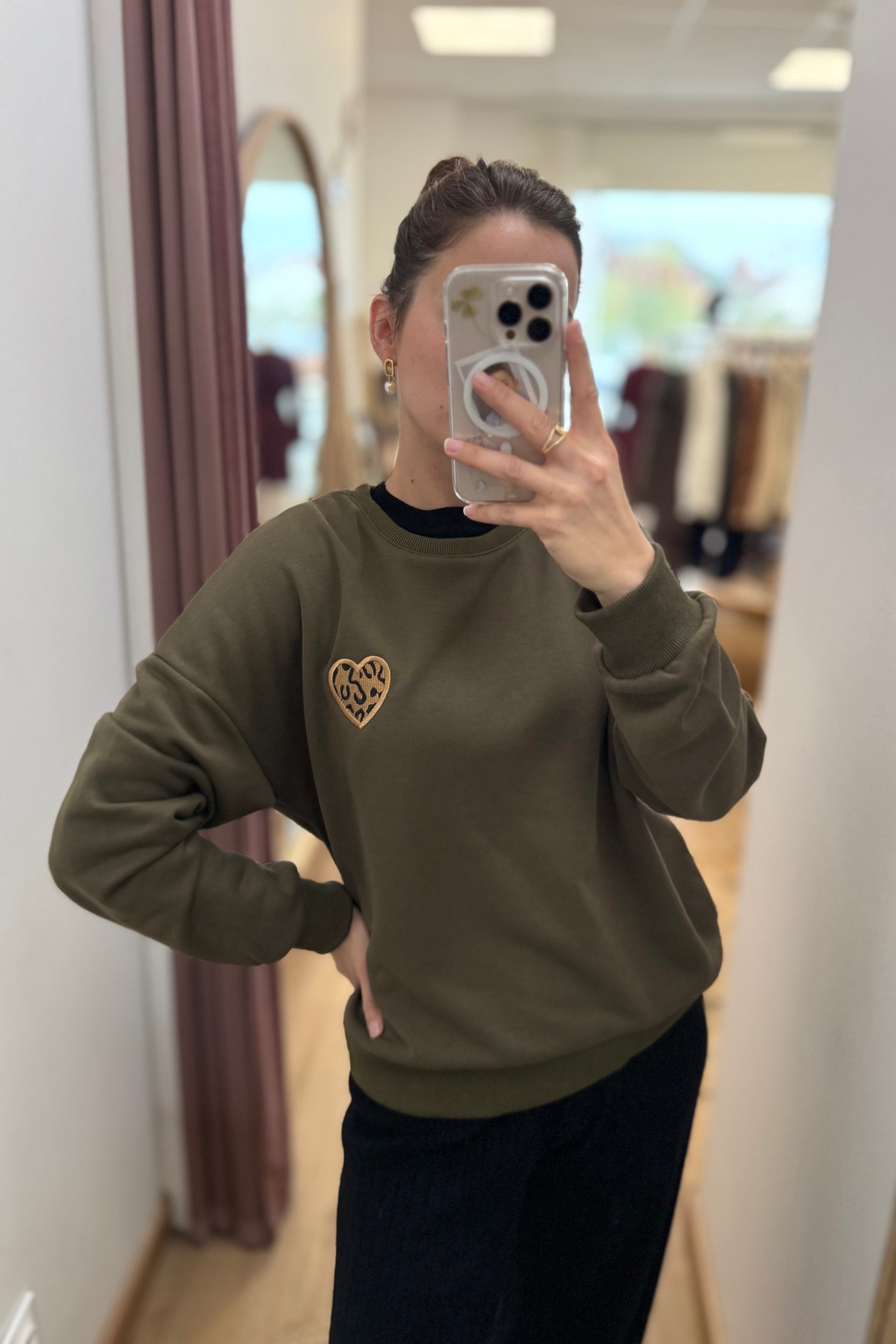 Sa teinte kaki, facilement associable à de nombreuses tenues, est sublimée par un motif cœur léopard placé sur la poitrine, apportant une touche d’originalité et d’audace subtile.