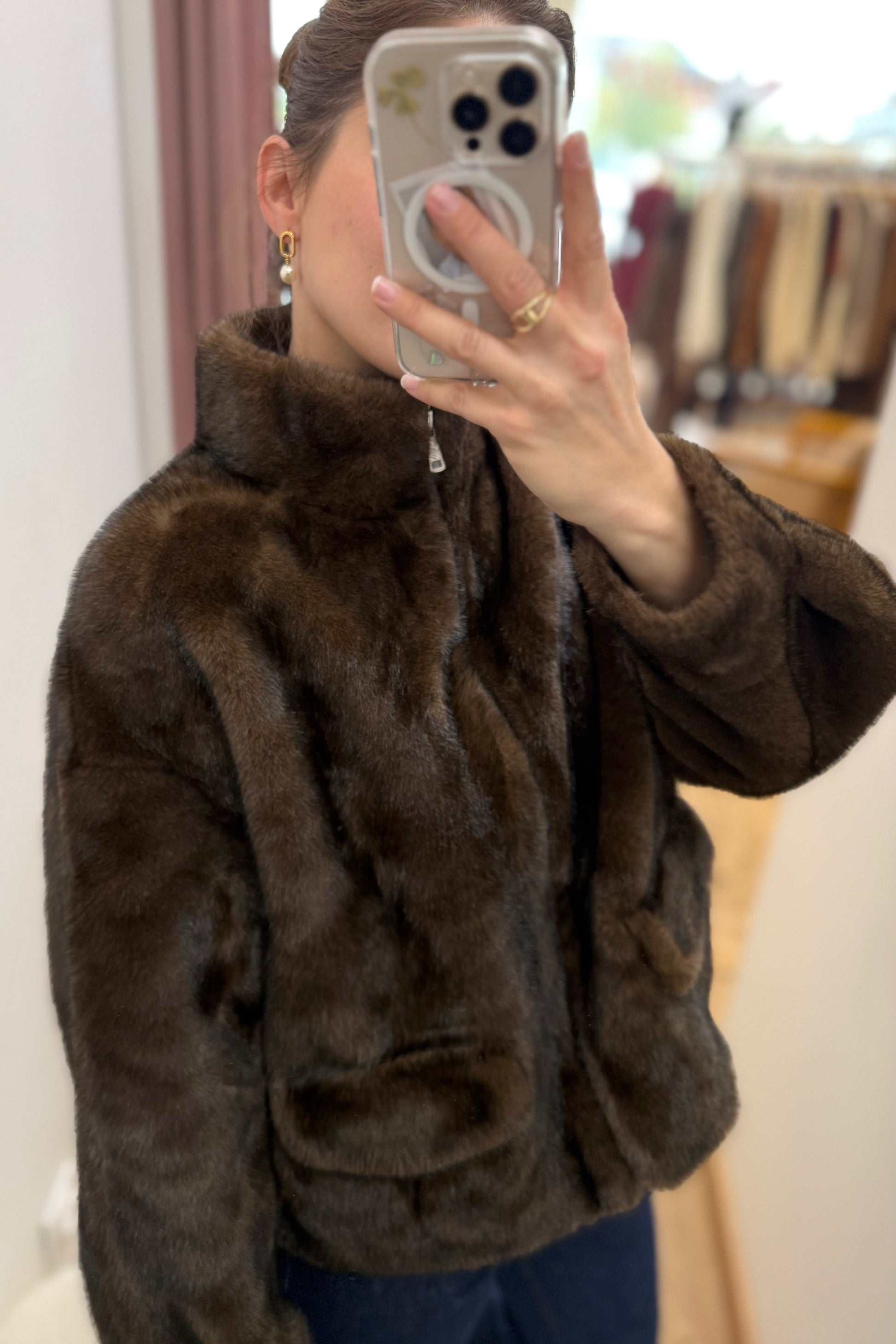 La veste en fausse fourrure allie élégance et praticité avec sa coupe droite confortable et son col montant qui protège du froid.